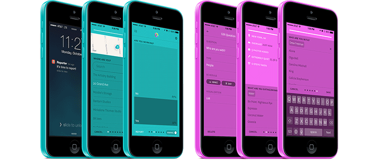Instead of logging items as they happen, like drank water or did something, like you do with other tools, Reporter sends you periodic surveys which you complete. Your answers to these questions are combined with additional data from your iphone like how many steps, how loud your environment is, your location, current weather, and who you are with. You get both your answers and an overall context.