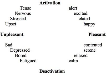 One example of moods in terms of dimensionality scale is Circumplex Model, which can visualize this way: