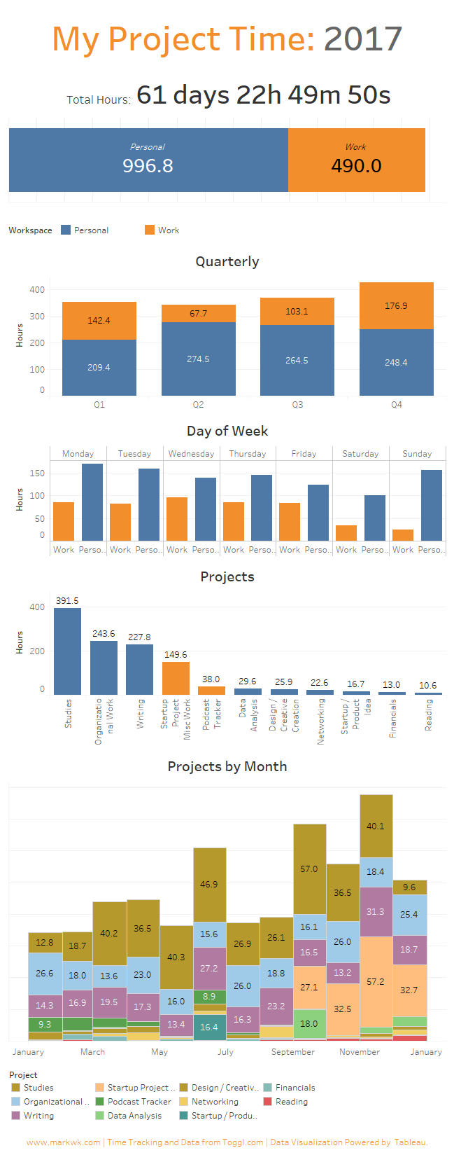 While I’m a huge fan of passive time tracking with RescueTime, I also find that manual time tracking really helps me too. It’s a conscious act to focus on some project or group of related tasks. I use Toggl to manually track where my time went each week. Here’s what my 2017 looked like in terms of project time: