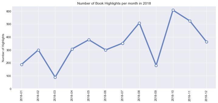 Overall, compared to 2017, I took less highlights in 2018 (5,531 vs. 4,086), and I highlighted less books (119 vs. 91). There appears to be some degree of correlation between number of highlights and if the book was rated highly or chosen as a personal favorite.
