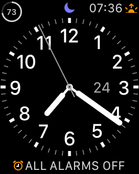 This view covers my battery life, sunrise/sunset time and alarm settings. My main usage is direct access to my alarm settings. Actually I find the subtle, vibrating alarm on the Apple Watch to provide a smoother wakeup than the auditory alarm I’m used to.