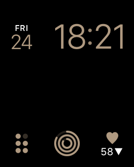 The one in the bottom, right corner is my current heart rate. The one in the bottom, center is my activity circles, which is Apple’s clever visualization for encouraging you to move, exercise and standup throughout the day. (We will look more at these activity circles later.) The one in the bottom, left corner is for my habit tracking app, Streaks. Essentially Streaks shows me filled dots for how many habits I’ve completed and empty ones for those I haven’t done yet.