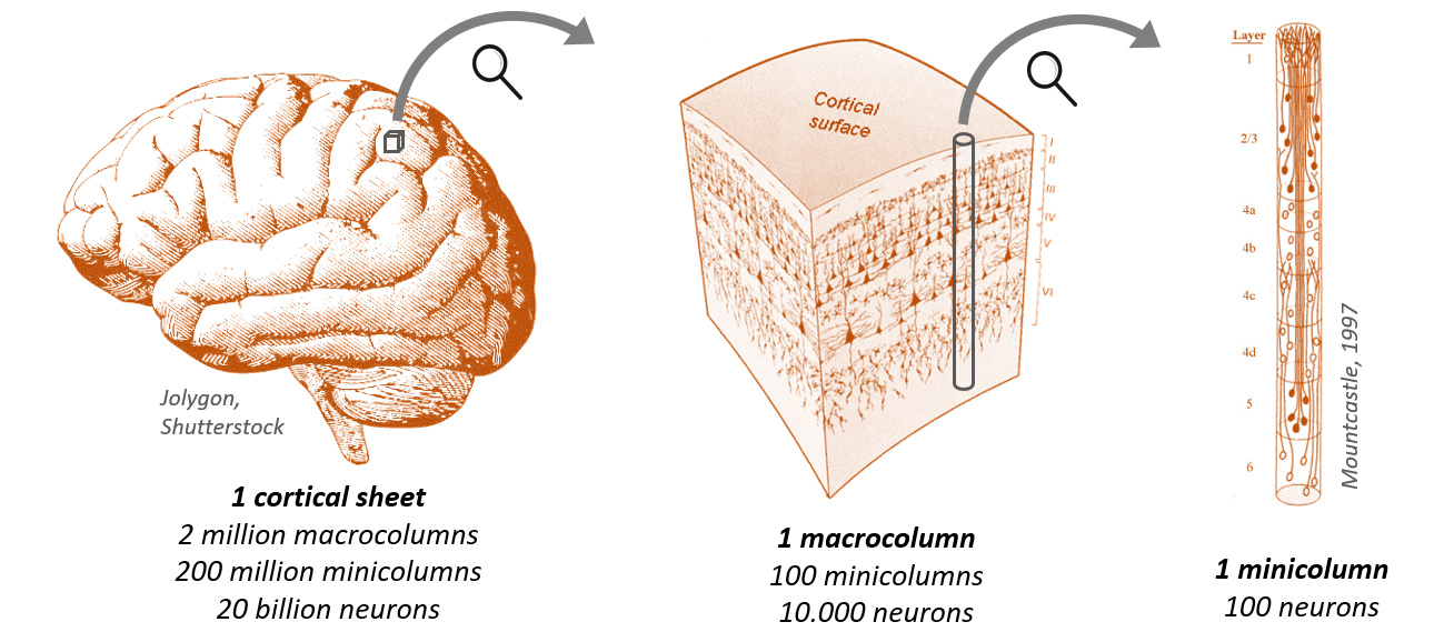 Cortical columns are proposed to be the fundamental microcircuits for cognition in neocortex. The fundamental concept is that the neocortex is not a single, unified processor, but rather a collection of approximately 150,000 independent sensory-motor modeling systems, each located within a cortical column. Each operates in parallell and coordinate high-order intelligence including learning, prediction and decision-making.