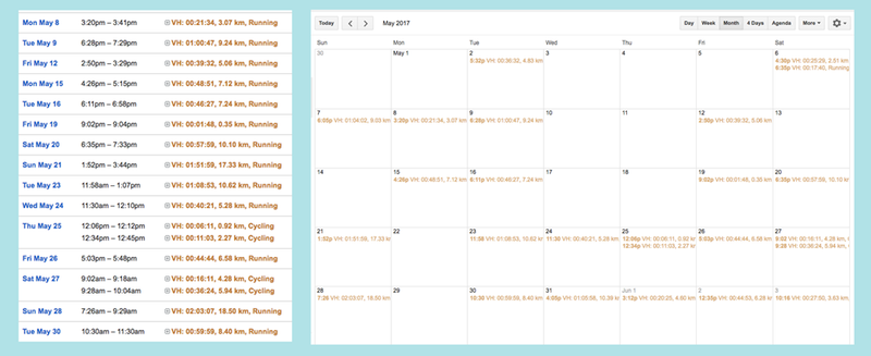 Our calendar can also become an aid in visualize the time we put into our physical life, including where we are and where we move about. It can also display a entry for our workouts like runs, cycling and strength training as well as simple activities like short walks. I find this merged calendar of my fitness to be a great aid in understand my active week.