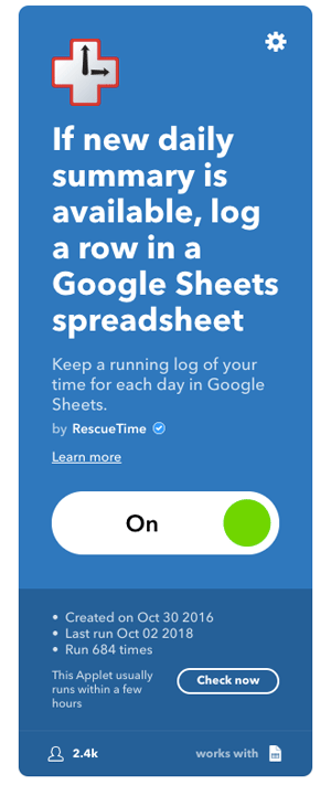 The most convenient way to collect your on-going time data from RescueTime is with IFTTT. IFTTTT stands for “if this, then that.” It is a well-known automation service that allows you to integrate and glue different services together. For example, you can automate re-posting an Instagram post to Twitter or Facebook. The basic logic of IFTTT is that you have services you connect to, and then using events from those services, you trigger customizable actions. In their lingo, these events or triggers are the “IF” and the actions are the “THAT.”