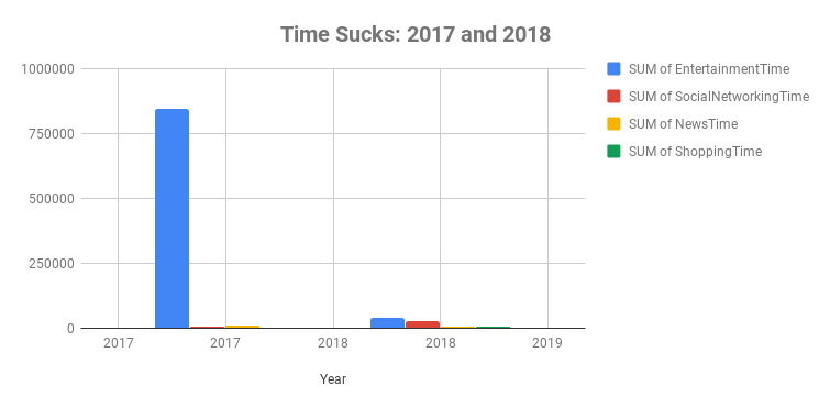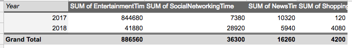 Following the steps from the last section, let’s create another pivot table to explore a few different time sucks in my life, like entertainment, social media and news sites.
