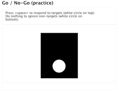 - Go/No-Go: In this test you are shown either a black screen with either a white square at the top (target stimuli) or a white square at the bottom (stimuli meant to be ignored). The cards are presented one by one and your task is to tap the space key when the target appears and ignore the non-target. Statistics are kept on how fast you react and your accuracy (successful taps vs. tapping on non-target), and a final test score is generated. This attention test is similar to the T.O.V.A.