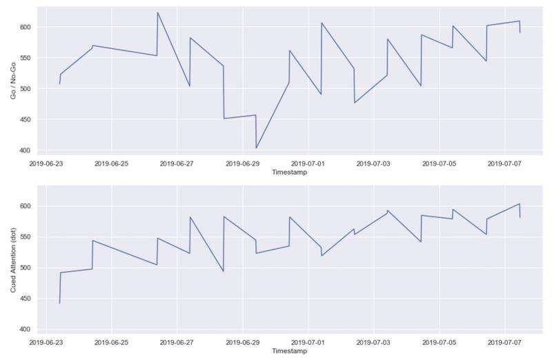 As shown in TABLE 2, all testing results improved during re-testing. In aggregate of Before/After, Go / No-Go showed a Cohen Effect Size of 0.47 and Cued Attention in 0.68. This would indicate a medium effect overall. Due to the sampling size (28), further testing is likely needed to confirm the results in greater detail and with higher confidence.