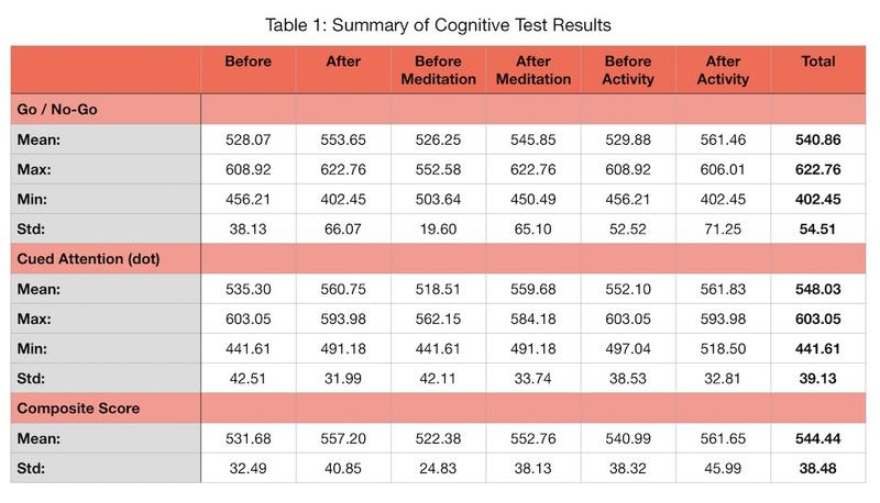 As summarized in Table 1, the highest scores were for the most part after either meditating or an activity. As showed in Table 2 and explained before, statistical analysis using Cohen’s D did indicate there was a sizable effect in before and after with the highest effect size being 1.08 in before/after meditation on Cued Attention test.