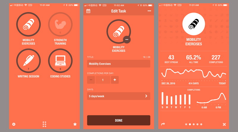 In Track Your Habits, Change Yourself: Tools for Self-Tracking Habit Builders, I go into detail about the importance of habit tracking and some of my favorite tools for keeping me accountable for my habits and goals. Currently my favorite app for habit tracking is Streaks. It’s a simple yet powerful iOS and Apple Watch app that lets me track a few habits, check them off accordingly and see some data visualizations. Here are my weekly habit objectives as well as my setup for tracking my mobility habit:
