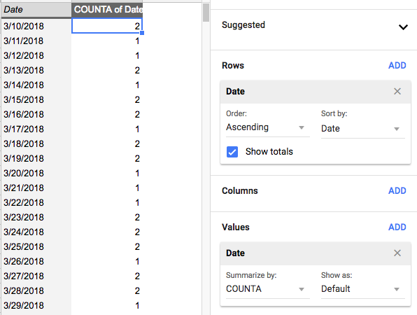 - Create a pivot table with “Date” as Row and Date as Value with COUNTA.
