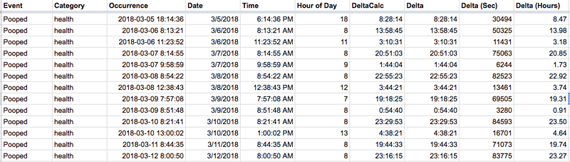 These steps allowed me to calculate the time delta between events and provided the key metrics I wanted, the time delta between poops.