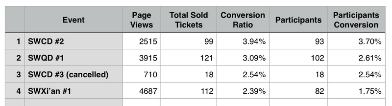 Since moving all mainland China events to a centralized ticketing platform, we’ve been able to better understand our traffic and conversions. While we still had a few “out of system” events at the end of 2014 that did provide data like Shanghai, we do have a pretty detailed picture of traffic and conversion rates.