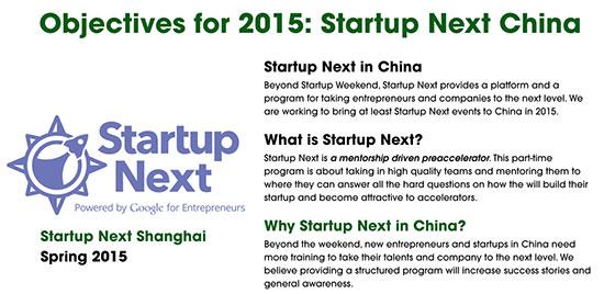 For China, we are excited to be running our first Startup Next program in Shanghai in spring 2015 with Todd Embley and the team at Chinaccelerator.