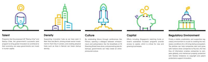 In short, this white paper highlights 5 key aspects of a startup community as drivers of innovation: 1. Talent, 2. Density, 3. Culture, 4. Capital, and 5. Regulations. These are help in the success of an underlying startup community.