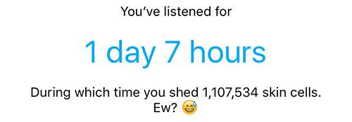 It’s not a perfect number. Unlike a service like Last.Fm which we looked at in detail in “Tracking the Soundtrack of Your Life”, Pocket Casts statistics leaves much to be desired. You can only see your total listening stats on Pocket Casts. In that sense, unlike Audible you don’t have a breakdown of daily, weekly or all-time stats. There are no nifty looking graphs either. It’s a single statistic of your total listening stats in days and hours and a bit of comparative stats on skin cells you’ve lost or how many times you’ve blinked.