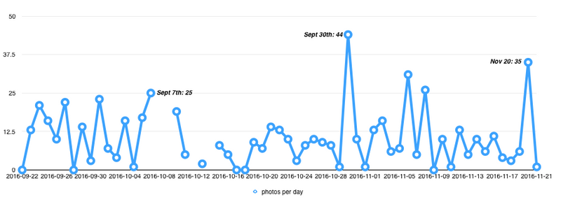 Here are my photos per day on my iPhone from Sept 22 to Nov 20th (note this also include screenshots):