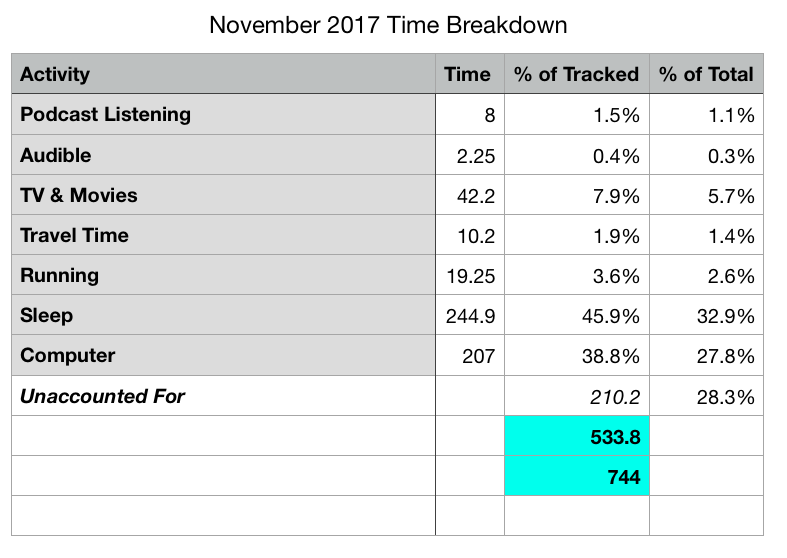 Time Tracking remains one of my favorite areas to track. In November I aggregated my time tracking into a simple table: