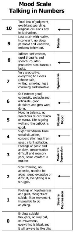 I’ve included a table of the Mood Scale used with Bipolar disorder. This is a fairly typical method of measuring moods in psychology.