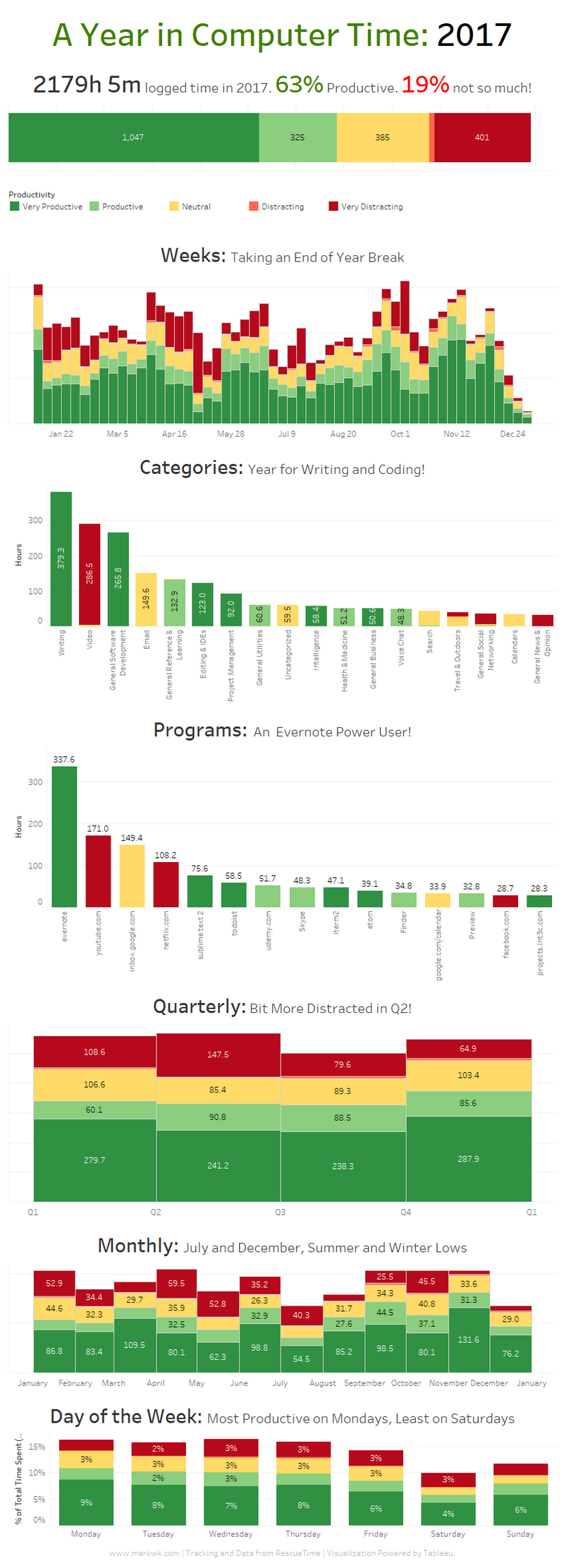 I continue to strive to remove distractions from my work life and avoid anything unnecessary in pursuit of my objectives. Using my RescueTime data, I can see various trends throughout the year, but most positively I was able to get more productive and less distracted as the year progressed.