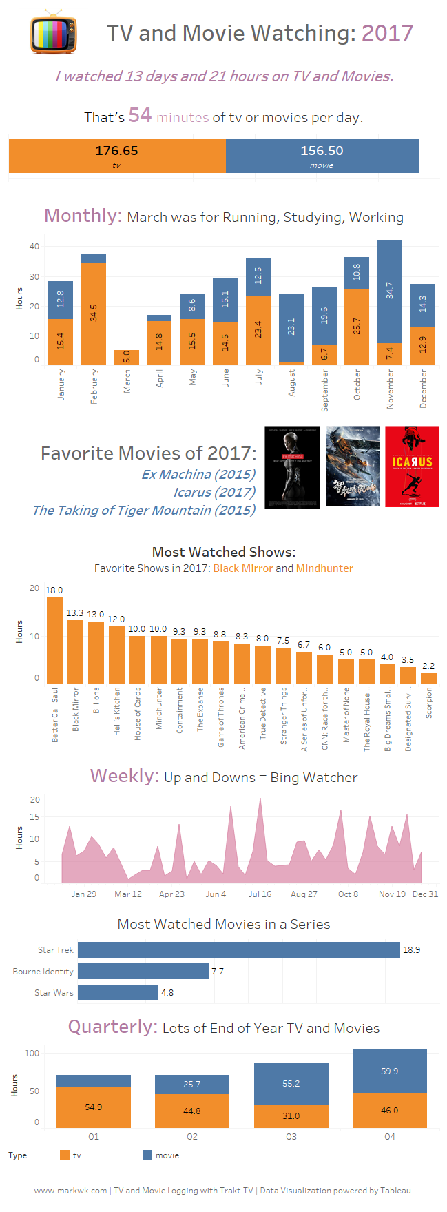 2017 was an interesting year for me, and numbers can’t exactly catch it all. Number do tell an interesting story and open unique ways to retell a year or remind you about how a year went.
