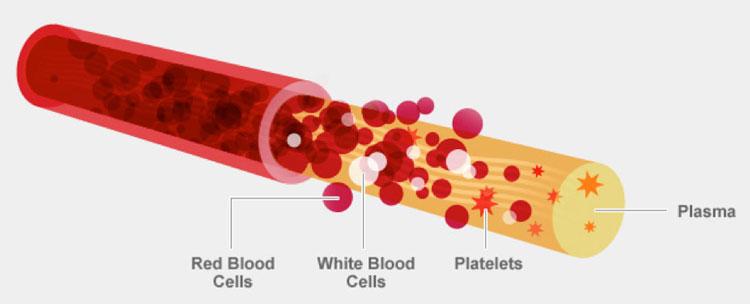 Blood mostly consists of plasma, which the primary fluid aspect of blood and makes up 54% of the blood’s total volume. Blood also contains a mix of proteins, glucose, minerals, hormones, carbon dioxide and blood cells themselves. Amongst the blood cells, the biggest number are red blood cells (RBCs), which make up 45% of blood. Additionally you have white blood cells (WBCs) and platelets.