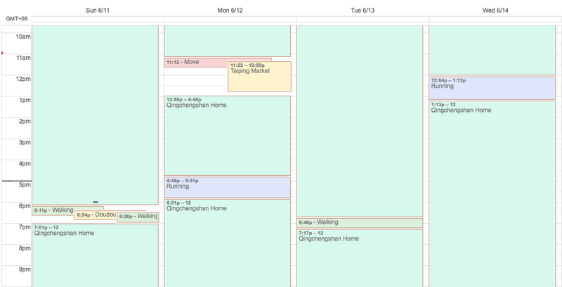 Here is a selection of four-days that combines my fitness calendar (for scheduling workout sessions), my Moves data (Places and Movements), my run tracking (from RunKeeper and Strava) and my strength workouts: