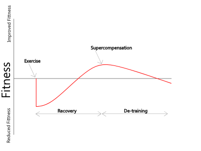 Exercise actually weakens you. It’s through rest and recovery that your body compensates, and you gain fitness. This is the up-and-down cycle of stress-recover-improve.