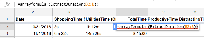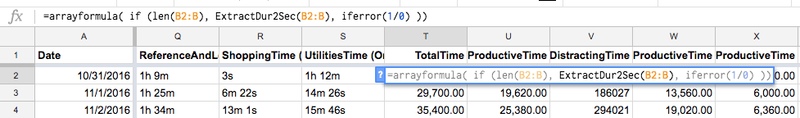 At this stage, you’ll probably have noticed RescueTime’s imported duration format, which looks like 4h 31m, 21m 39s, 5h 32m, etc. This is a human-readable duration format, and some spreadsheet applications can read and parse this. Unfortunately Google Sheets cannot. This creates a bit of a challenge for us if we want to use this data.
