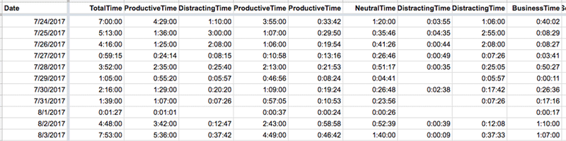 In order to get the “best” data, you can some code to directly pull your data from the API. RescueTime’s API is well-documented and well-maintained. I’ve even written some code so you can use to start collecting your RescueTime data using Python. The main benefit of using code is that you can collect your legacy data as well as get your tracking logs at a low level like by hour or even by minute. Furthermore, the data you get from the API is really well-structured with clear designation for the category, application and seconds spent.