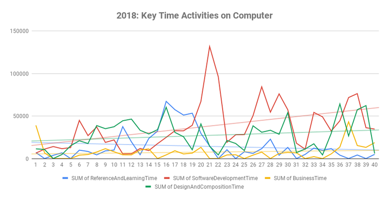Once again create a pivot table using categories like SoftwareDevelopmentTime, DesignAndCompositionTime, ReferenceAndLearningTime, and BusinessTime. These categories correspond to where most of my time goes as well as my main focus for my targeted time usage. In my case, I’m using weeks for the row or dimension, and I’ve filtered this to just 2018.