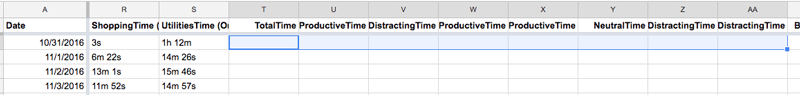 After you’ve added this recipe, once a day your daily summary data from RescueTime will be pushed into a Google Sheet via IFTTT. In its raw state it will look something like this: