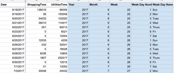 In this post, I want to walkthrough setting up a simple time tracking dashboard with RescueTime, IFTTT and Google Sheets. First, we will use IFTTT for data collection from RescueTime into Google Sheets. We will then leverage some code in Google App Script to process and prepare our data. We will use some custom functions in Google Sheets to create some time dimensions from our date field. Finally, we will use some simple pivot tables and charts to do some personal data analysis. We are turning our tracking data into improved self-understanding.