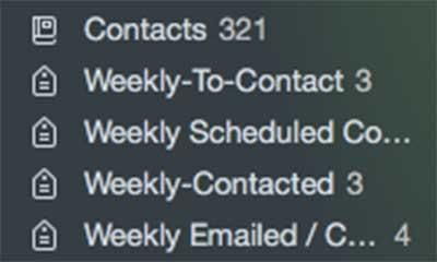 As you can see in this example, I have tagged next steps for each week, i.e. weekly to contact, weekly to schedule contact, weekly contacted, etc. This provides a high-level starting point for the networking I hope to do in a week. Furthermore, once I have taken a step, I change the tag and move them to a different stage like “Weekly-Contacted.” Overall, this is a simple way to quantify or “keep score” of your networking efforts. I have numbers to look to see if I’m on schedule and it can really help you to hit certain objectives if you track it.