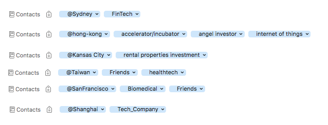 The first thing you might notice is that I’m using a location tagging convention with the @ sign. Each contact gets assigned with a @PLACE. This is a great way for me to look back later to see who I know somewhere. Place-specific tagging is critical for a good contact setup. For example, with this, it is especially easy for me to pull-up my contacts in a city I visit and add a few additional meetings while there.