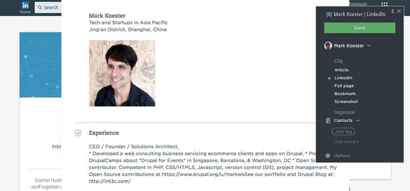 When it comes to LinkedIn and building out the contacts in your Evernote CRM, the Evernote Web Clipper works great. It pull out the person’s name and title, picture and formats their intro and work history too.