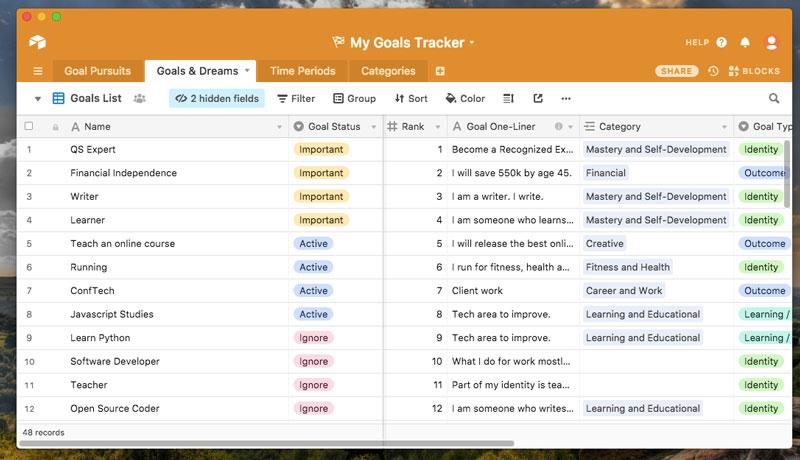 In the rest of post, we are going look at the core features and usage of Goal Tracker for Airtable. We will first briefly look at AirTable, what it is and how it works. After that, our main objective is to get you up and running with using the tool to track and manage our goals. Along the way, I’ve included a few examples of customizations and deeper concepts related to how AirTable works and how it relates to both the science of goals and productivity principles for good goal management. Finally, I’ll conclude by sharing my own motivation for building this tool and tips for the overly ambitious goal pursuer been using it.