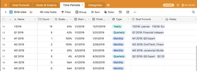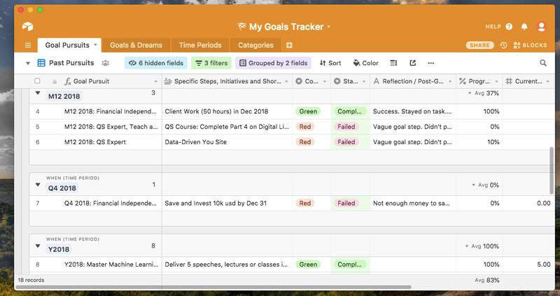 Using Airtable, which is a mix of a spreadsheet application and a database, I’ve created a goal tracker that allows me to keep an on-going list of my goals and dreams and to convert those into periodic goal pursuits that I further track, manage, and optimize. Additionally, the flexiblity of AirTable allows you to apply some of the most actionable and effective techniques from the science of goals. This means we are not only tracking what’s happening but we are applying powerful strategies to get better at reaching our goals.