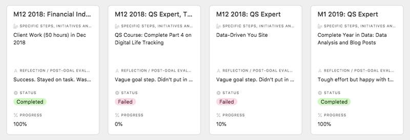 Using the tool, you now have a list of goal pursuits so you can better organize and visualize over time. Goals are a struggle and will fail, but having a tool to organize and track allows you better stay on top of the process. You are not only pursuing a goal but also optimizng the meta-skill of managing goals. By consistently linking goals with a specific initiative in a certain time frame, you have effectively applied several key techniques from the science of goals too.