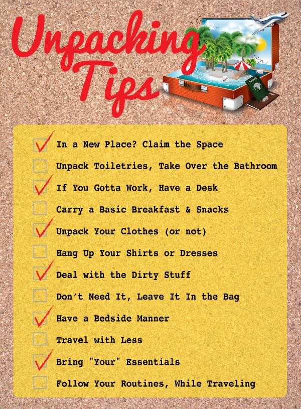 In this post, we looked at some essential tips to help you travel and unpack right. Whether it’s organizing your clothes and toiletries or setting up your work space, the idea is simple: When you get to where you are staying, mentally claim it.