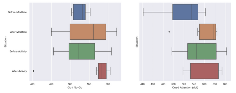 I believe these initial results offer a good starting point for both more research and future experiments that includes more testing samples, differerent meditation types, and a more robust crossover design. Ideally, along with more samples, a wider range of activities and meditations can offer clues into acute effects of pre-testing situations and activities. Our question then becomes: What activities best cue or prime us towards higher performance for cognition as measured by cognitive tests?