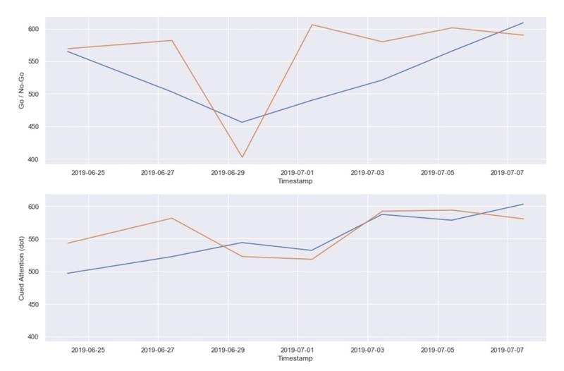 As shown in TABLE 2, all testing results improved during re-testing. In aggregate of Before/After, Go / No-Go showed a Cohen Effect Size of 0.47 and Cued Attention in 0.68. This would indicate a medium effect overall. Due to the sampling size (28), further testing is likely needed to confirm the results in greater detail and with higher confidence.