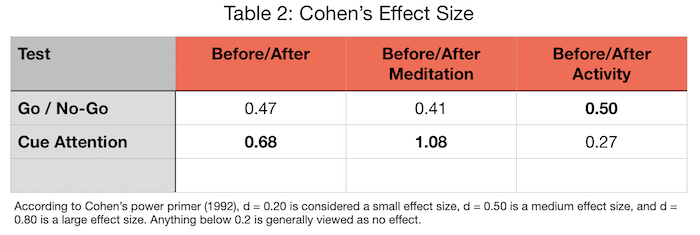 As shown in TABLE 2, the results showed a significant Cohen’s effect size in before and after for both meditation and activity. The highest specific effects were on Cued Attention in Before/After Meditation (1.08) and and Go / No-Go in Before/After Activity (0.50).