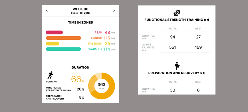 For me, my preferred method of getting a quick sense of my cumulated mobility time is with Zones App. Zones is an aggregator and visualization tool for your Apple Health Workouts. It provides a nice weekly report where it breaks down your key stats:
