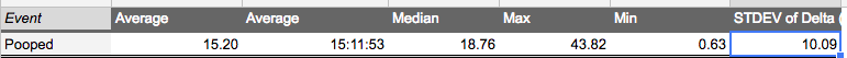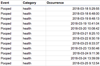 These steps allowed me to calculate the time delta between events and provided the key metrics I wanted, the time delta between poops.