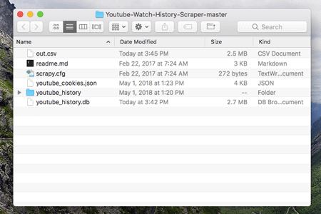 This process might take several minutes depending on the spend of your internet and how extensive your Youtube History is. Once completed you should see in your directory the follow file: youtube_history.db.