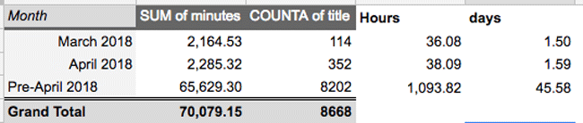 The grand total: 70,079 minutes of total youtube watching. Broken down over the last two months of more accurate tracking, I watched about 37 hours or 1.5 days worth of Youtube videos per month.