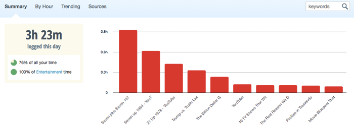 As I write about in detail in How much time did that take? Time Tracking Tools for Self and Freelancing, RescueTime is an application you install in the background on your computer, which logs which applications and websites you use and for how long. There are then a number of settings you can adjust to determine if that service is productive, distracting or neutral for you as well as the category it falls into it. Setup is simple, tracking is done passively, and, in only a few days of logging, you can quickly get a portrait of your time usage. RescueTime can also be great service for continuous lifelogging too, allowing you to know where your time was spent any day in the past.