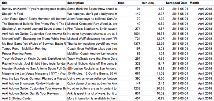 As you can see, I’ve gone ahead and converted seconds to minutes, added a column for when I scrapped the data and tagged the month watched too. In the case of videos before I started tracking, I added a generic pre-XXX date. This allows me to keep some aggregate stats going forward.