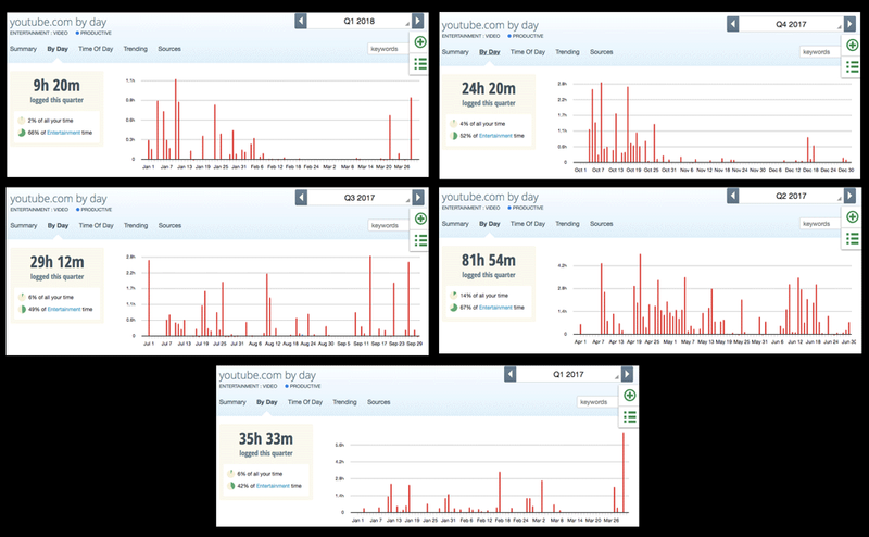 Fortunately or unfortunately, I’ve nearly completely stopped watching Youtube on my computer As you can see, over the last quarters I’ve reduced how much time quite significantly: